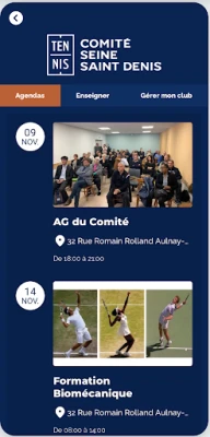 Elle vous permettra d'avoir des informations sur : • la gestion de votre club • l'enseignement du tennis • les évènements du Comité • les clubs du département (tous géolocalisés) • les agendas tennis • les évènements • les newsletter • Adoc • Tenup
