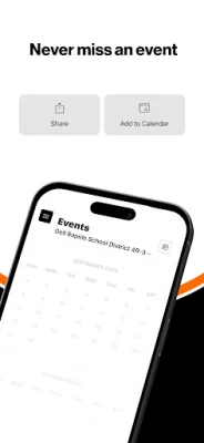 NEVER MISS AN EVENT The event section shows a list of events throughout the district. Users can add an event to their calendar and share the event with friends and family with one tap.