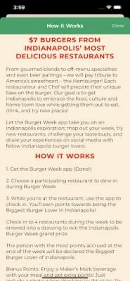 Let the Burger Week app take you on a Indianapolis exploration; map out your week, try new restaurants, challenge your taste buds, and share your experiences on social media with fellow Indianapolis burger lovers.