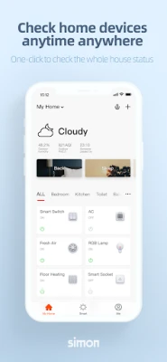 Through Simon Smart App, you can conveniently manage each Simon Smart hardware in your home, check the running status, change the setting parameters, flexibly define the scene configuration, manage the home users and permissions, make your Smart home different, and better understand you for you.