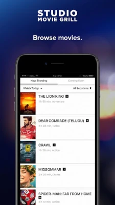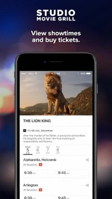 The all-new Studio Movie Grill ticket app is the easiest way to purchase reserved seating for the biggest movies of the year at your local SMG. Browse movie listings and showtimes, purchase tickets, save ticket confirmations, and sign up for SMG Access to get points with every ticket purchase.